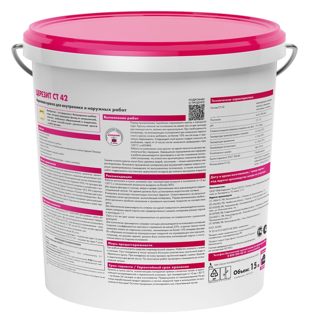 Краска СТ 42 -краска на водно-дисперсионной основе. Предназначена для окрашивания минеральных и акриловых декоративных штукатурных покрытий, таких как CT 35, CT 137, CT 60, CT 63 и CT 64, а также бетона, цементно-песчаных, цементно-известковых и известковых штукатурок, как внутри, так и снаружи зданий. Рекомендована для систем теплоизоляции фасадов с пенополистирольными плитами (Ceresit EPS).