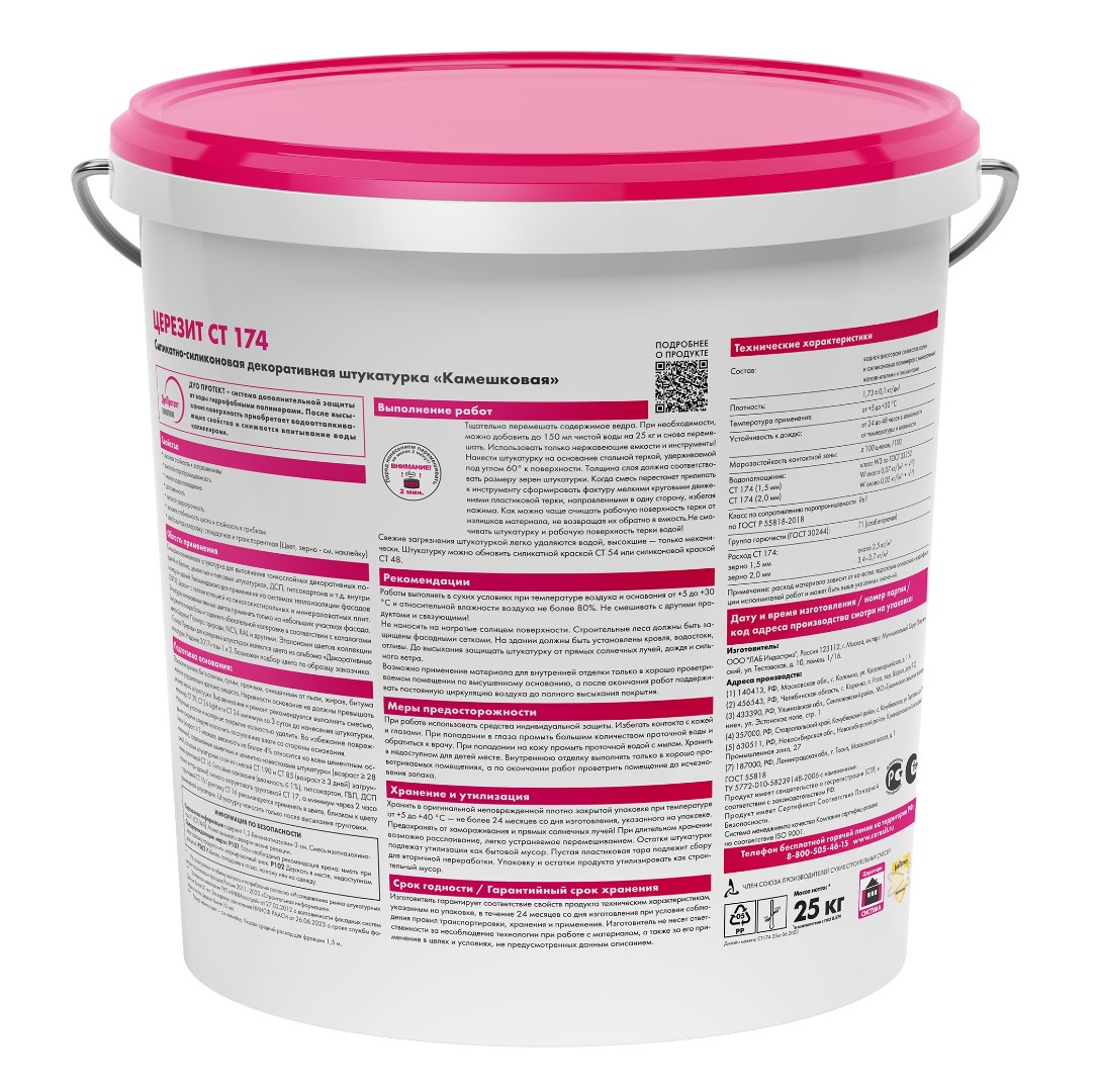 Штукатурка СТ 174 силикатно-силиконовая "камешковая" 2 мм база 25 кг предназначена для создания структурных покрытий на поверхностях фасадов и внутри помещений, в том числе при устройстве систем теплоизоляции фасадов (c пенополистирольными и минераловатными плитами). Наносится на любые минеральные основания, такие как бетон, штукатурка (цементная и гипсовая), гипсокартон, древесностружачные плиты.