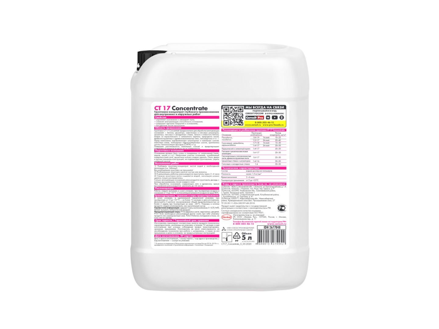 Грунтовка CT 17 Concentrate предназначена для обработки впитывающих, сильно впитывающих и непрочных оснований – бетона, цементных, известковых и гипсовых штукатурок, цементных, гипсовых и ангидритных стяжек, легкого и ячеистого бетона, кладок из керамического и силикатного кирпича, природного камня, древесностружечных и древесноволокнистых плит, гипсокартона– перед нанесением выравнивающих штукатурных и напольных смесей, плиточных клеев, полимерных гидроизоляционных мастик, креплением систем теплоизоляции фасадов (СФТК) .