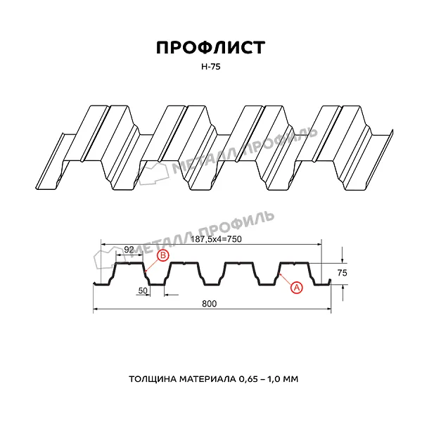 Профлист МЕТАЛЛ ПРОФИЛЬ Н-75x750-A (ПЭ-01-9003-0,65) — популярный материал для монтажа профилированного листа. Изначально он представляет собой лист оцинкованной стали с покрытием. Общая толщина металла с цинковым и полимерным покрытием — 0.65 мм. После проката на специальном оборудовании сталь приобретает рисунок из повторяющихся волн. Такая форма придает профилю жёсткость.